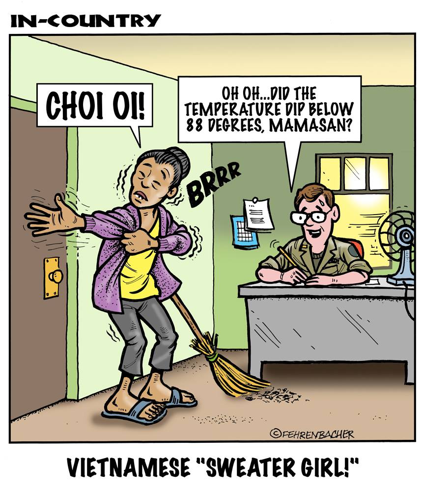 Phil enlisted in the Army in 1965 where he served for years in Vietnam. He became a graphic designer and has worked for the state of Oregon for 26 years. He retired in 2003 and started the Cartoon "In-Country". The cartoons reflect his experiences during his tour of duty in South Vietnam.